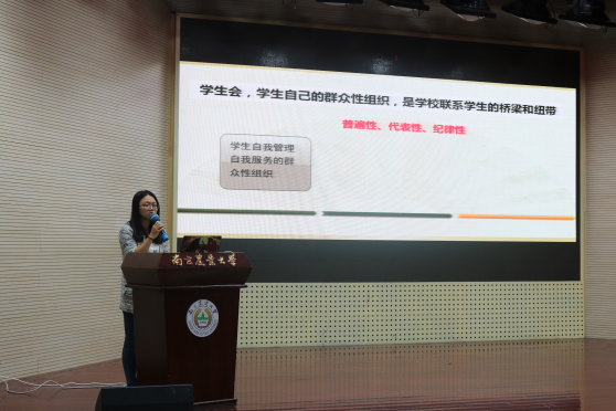 金洁南以“如何进行活动的策划与实施”为题进行讲座。她提到:员工骨干是一个服务者,而不是指挥者,需要为同学们奉献自己。接着她对活动策划与实施进行详细讲解,并提出员工骨干 “不忘初心,方得始终”的观点。