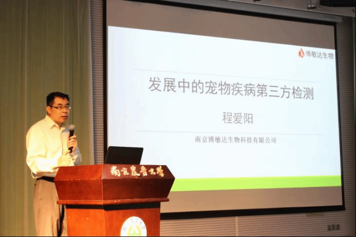 第二位是程爱阳总经理,他针对宠物疾病的第三方检验,从宠物医疗的历史讲起,作了系统而详细的介绍。结尾,他为博敏达生物进行了简短的宣传,并诚邀同学们加入。