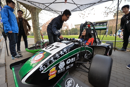 工学院展示了充满高科技气息的节能赛车、F1方程式赛车,并通过模拟器装置,模拟方程式赛车的比赛过程。