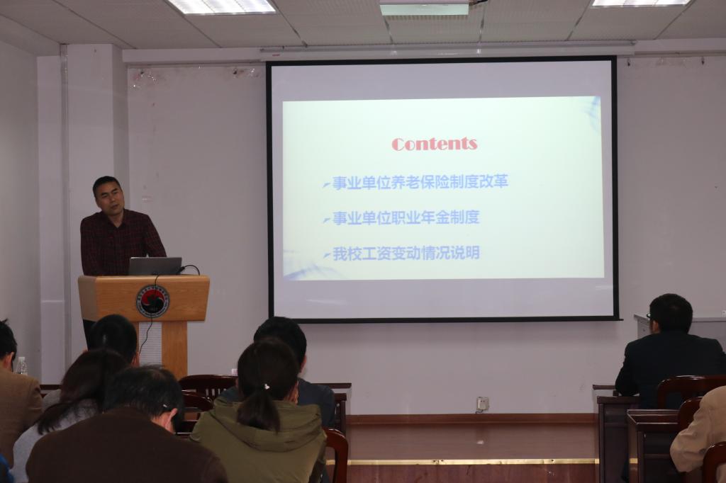 副处长周振雷作了题为《养老保险制度改革及工资说明》报告。从事业单位养老保险制度改革、事业单位职业年金制度、公司工资变动情况说明三个方面做了详解。