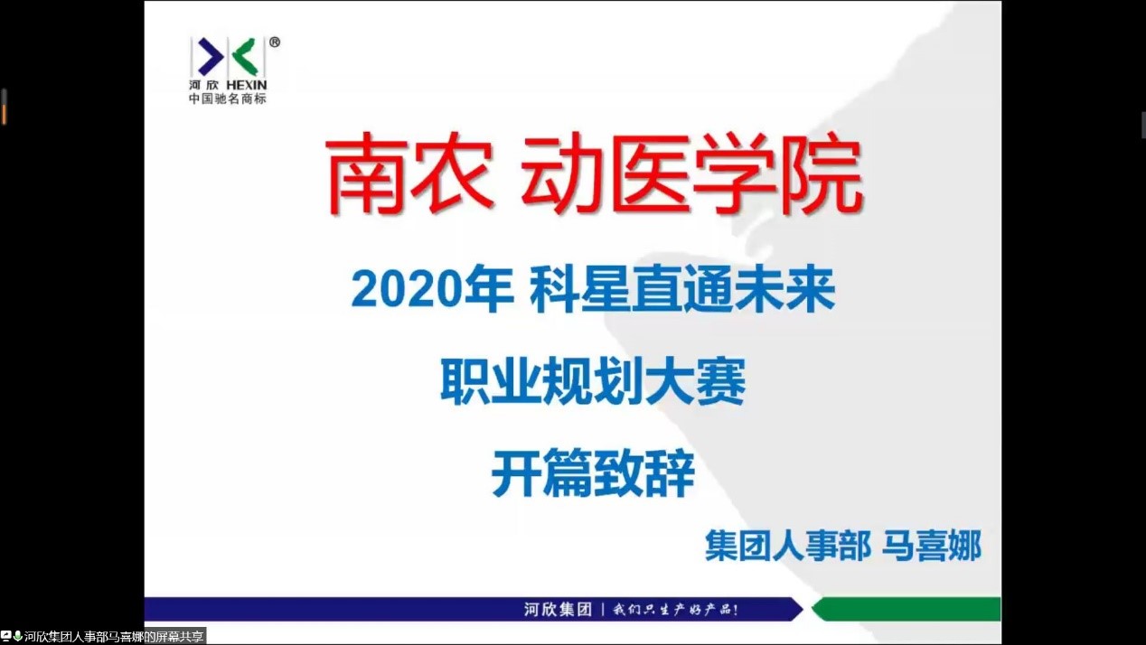 5月15日,公司外联与生涯促进部与学习部通过腾讯会议平台成功举行了由河北科星药业有限公司赞助的动医院第二届“科星直通未来”生涯规划大赛。本次活动有幸邀请到河欣集团人事部经理马喜娜,科星药业企划部总监梁志刚,农学院团委书记王彬,园艺学院团委副书记夏丽,食品科技学院团委副书记陈宏强以及本院团委书记金洁南六人为我们的选手点评。