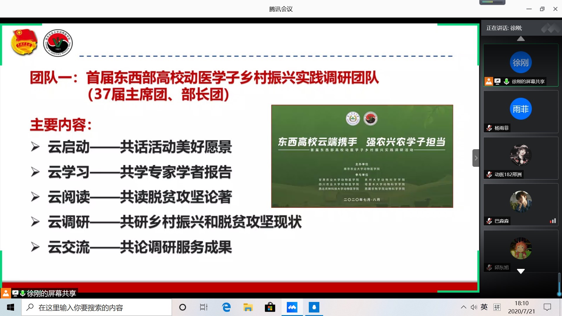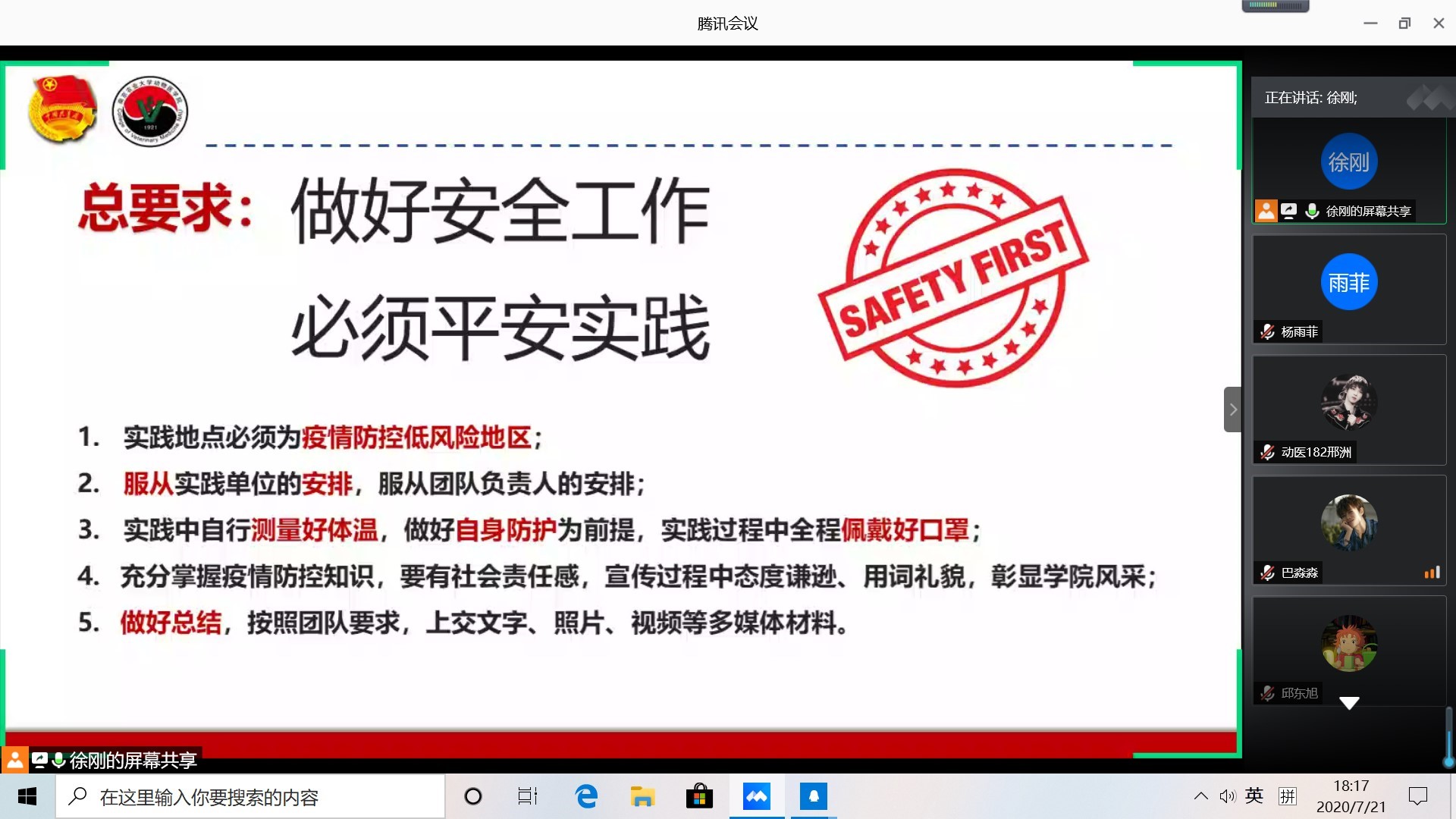 7月21日下午6:00,为响应“疫情防控”工作要求,公司2020年老员工志愿者暑期“三下乡”社会实践活动出征仪式,在腾讯会议云端召开。辅导员徐刚、李欣欣和2018级全体本科生参与了本次出征仪式。