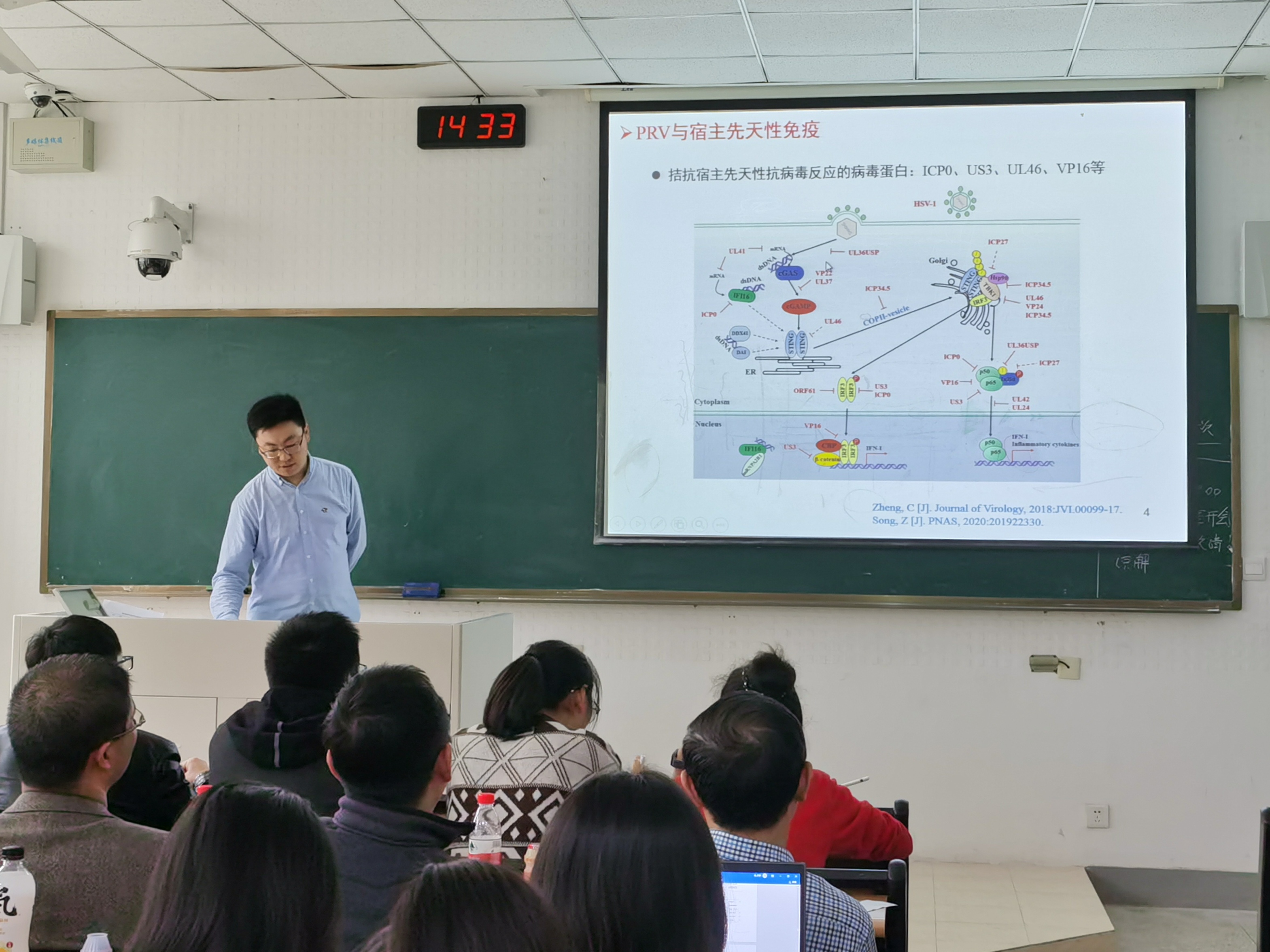 汇报题目《猪伪狂犬病毒UL13蛋白抑制先天性免疫机制及四基因缺失活疫苗毒株的构建》,从猪伪狂犬丰富的研究背景开始介绍,阐述伪狂犬病毒对猪的危害和致病机制,针对UL13蛋白进行免疫机制探讨和基因缺失活疫苗的构建。汇报内容详尽,评委老师们对汇报较为满意并对汇报时间的合理安排给出了中肯的意见。