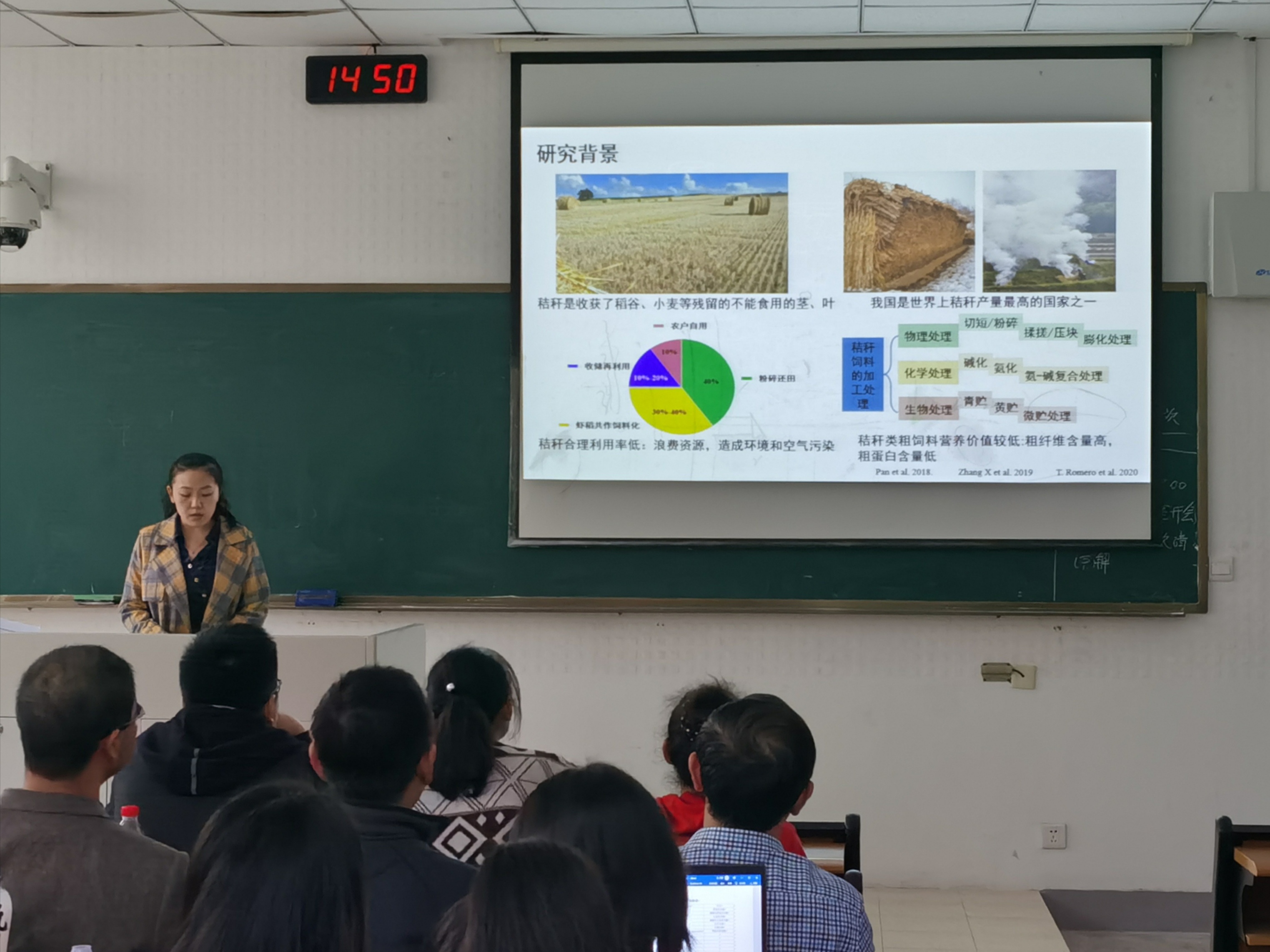 汇报题目《稻秸对湖羊采食的影响及其内分泌机制》,汇报内容围绕湖羊的采食展开,深入探讨湖羊内分泌机制,探究硬脂酸的作用机理及其如何影响GLP-1和CCK的分泌。评委老师对研究内容进行提问并根据汇报形式提出改进方法。