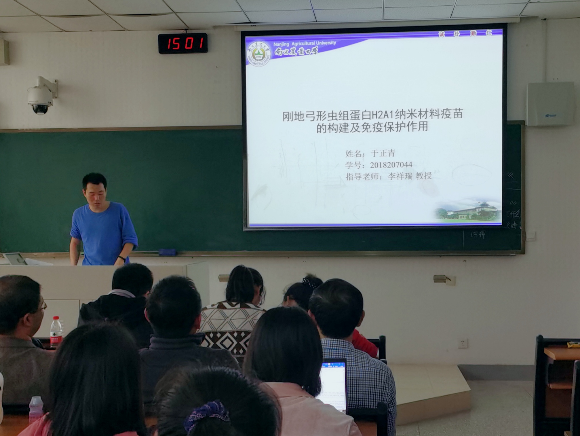 汇报题目《刚地弓形虫组蛋白H2A1纳米材料疫苗的构建及免疫保护作用》,以弓形虫作为人畜共患病病原的出发点提出该研究的重要性,探究弓形虫的致病机制并以其组蛋白H2A1为研究靶点,基于纳米材料构建非传统性疫苗,对疫苗进行免疫保护作用的验证和评价。评委老师对研究立意和内容进行评价,并针对汇报人的表达形式提出意见。