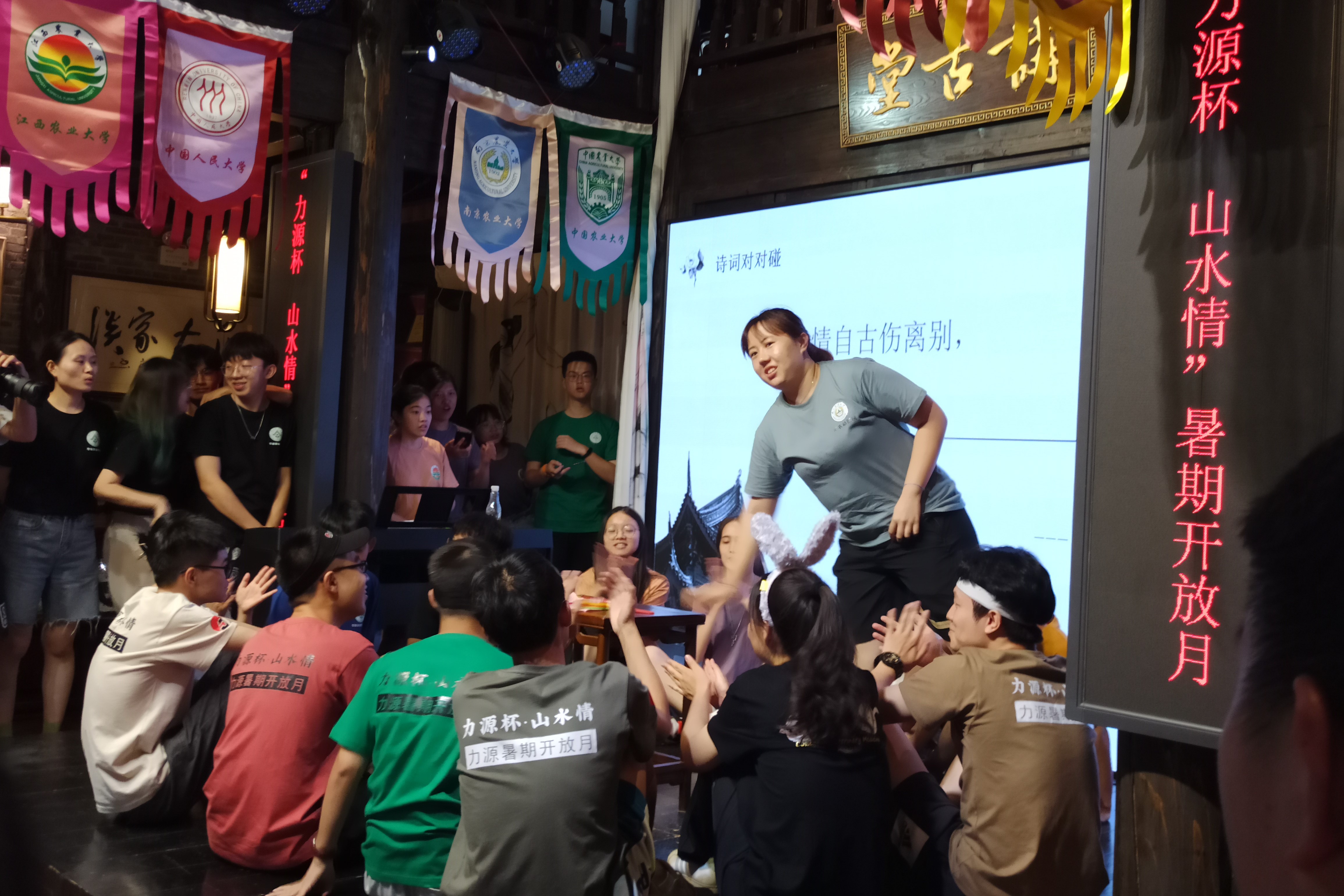 下午,团队来到讲古堂——东西巷仅存的四座古民居之一,是一个传播桂林本土文化,集曲艺表演、美学雅集、非遗体验、文化创意为一体的文化体验基地。在接下来的几个小时里,大家用智慧和热情,在这个精美的建筑中进行古风与现代的完美结合。在各校文艺汇演当中,穿插着文学常识竞赛,诗词对对碰竞赛以及飞花令环节。各校代表以文会友,为大家上演了一场又一场紧张而又精彩的比拼。火热紧张的比赛又伴随着意想不到的彩蛋,力源集团贴心的准备了广西特有的彩调《三看亲》,引起台下欢笑声不断。
