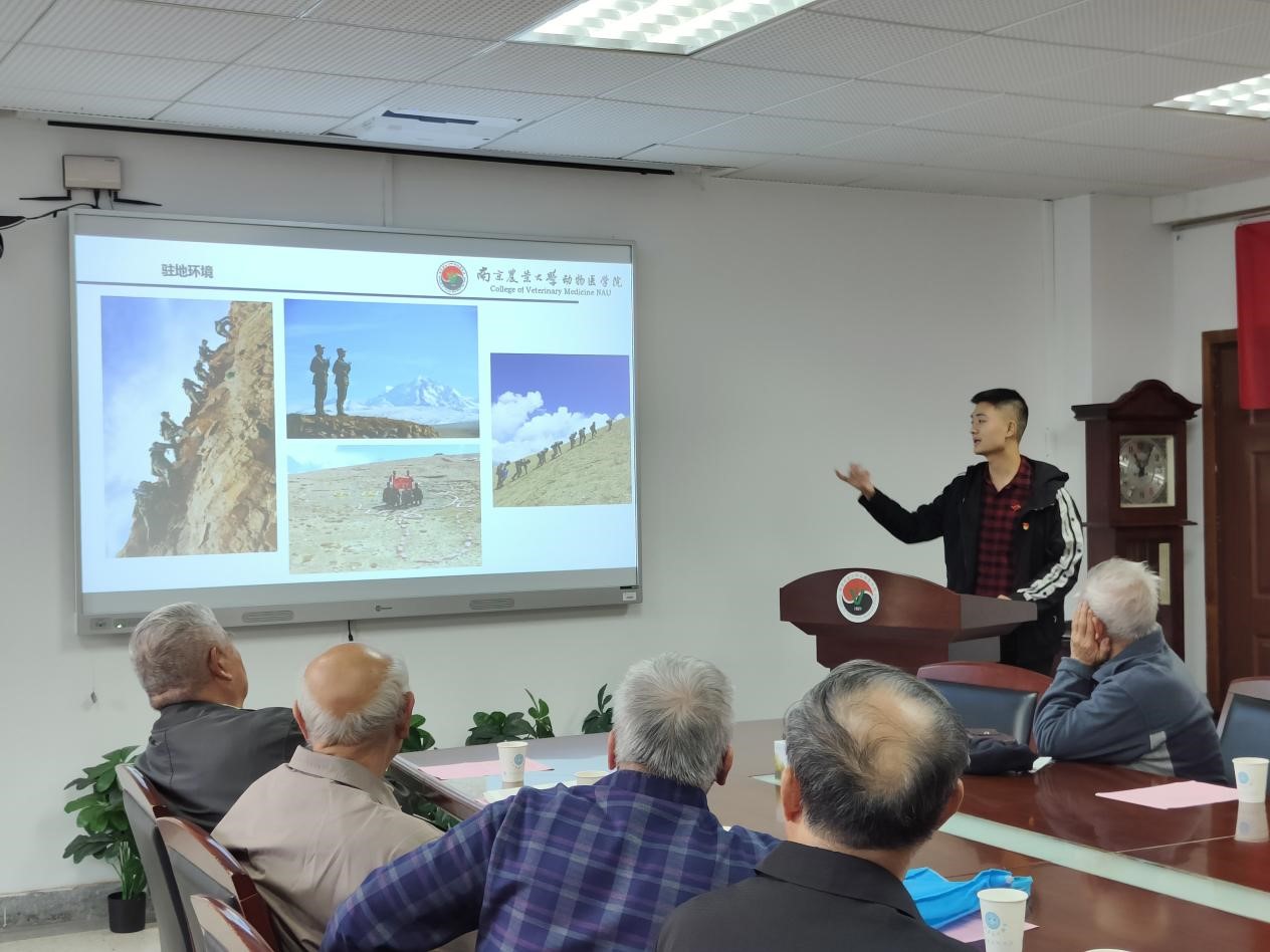 接着,优秀员工党员代表、2021级研究生新生刘怀成做了专题分享。他首先向纪录片中的先烈们表达了崇高的敬意。刘怀成是公司2014级本科生,2017年志愿入伍,驻地在西藏,地处尼泊尔和印度的交界处。此处海拔超四千米,环境恶劣,植被难以正常生长,冬日环境温度最低可达零下三十度,是一个与冰血长津湖中描述的志愿军将士所处的环境极为相似的边防驻地。服役期间,他满怀南农动医人不怕苦,不怕累,志愿为国家奋斗奉献的初心,用实际行动践行着“艰苦不怕吃苦,缺氧不缺精神”的青年担当。回校以后,作为一名兽医学子,他一方面努力学习专业知识,另一方面继续为学院发展和员工工作贡献力量,毕业后保研至本院继续攻读兽医硕士学位,牢记以解决生产实际问题,服务我国畜牧兽医产业经济为己任。