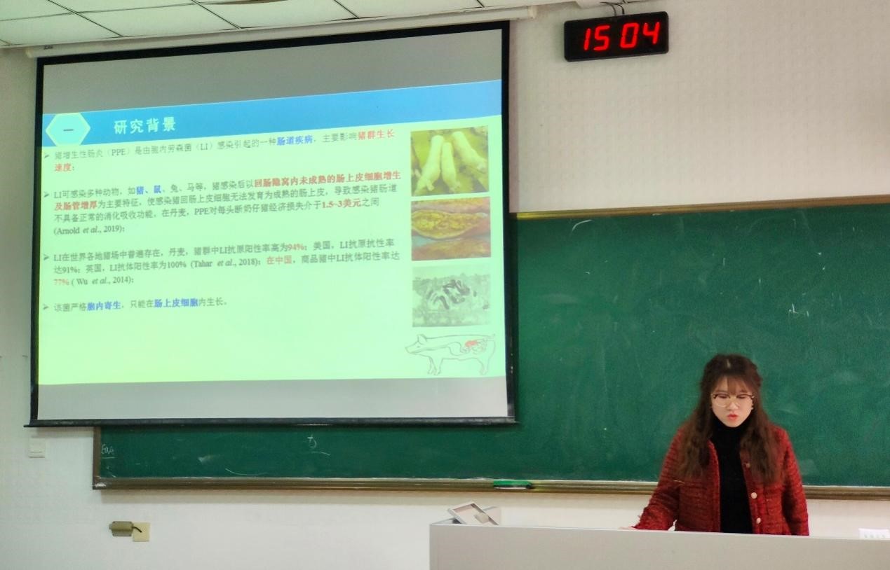 第一位汇报的是来自预防兽医学的梁萌,她汇报的题目是《捻转血矛线虫引起宿主TH9免疫反应的抗原鉴定》。该课题筛选出部分与TH9细胞结合的虫体分泌蛋白,在蛋白质组学的指导下对其进行研究,可为捻转血矛线虫的免疫防控提供新的研究思路和候选分子。评委老师对其研究成果及意义给予赞赏。