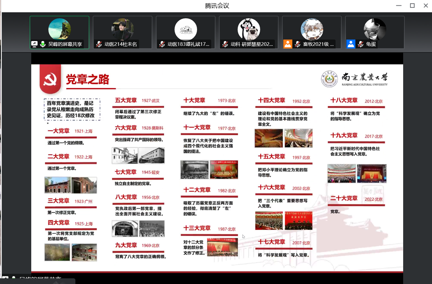 11月2日下午5点,公司通过腾讯会议举行了“永不退色的信仰”入党积极分子线上实践教学活动。本次报告由动物科技公司党委副书记吴峰主讲,QY球友会2022级秋季全体新发展入党积极分子线上参会。本次线上教学活动的主题是“永不褪色的信仰--党章之路”。