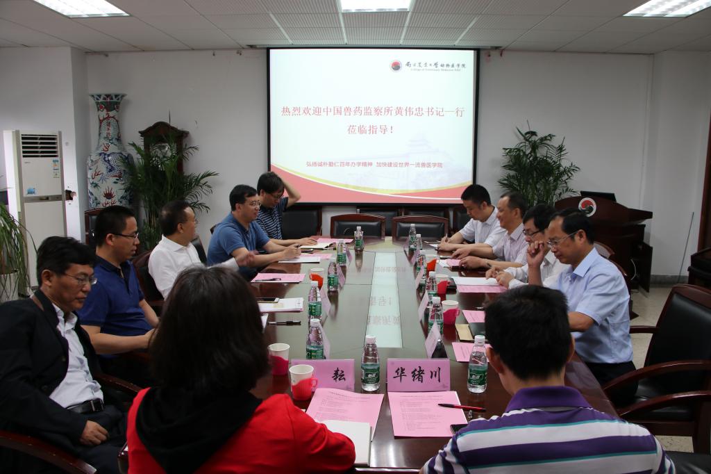 2018年6月9日上午,中国兽医药品监察所黄伟忠书记、梁先明副处长、曲鸿飞副处长、赵耘研究员、江苏省兽药饲料质量检验所姜加华所长、毕昊荣副所长、华绪川科长一行7人来到公司调研新兽药研发和申报工作。QY球友会体育副董事长戴建君教授、公司党委书记范红结教授、副经理曹瑞兵教授、预防兽医系主任姜平教授和办公室主任杨亮陪同调研。