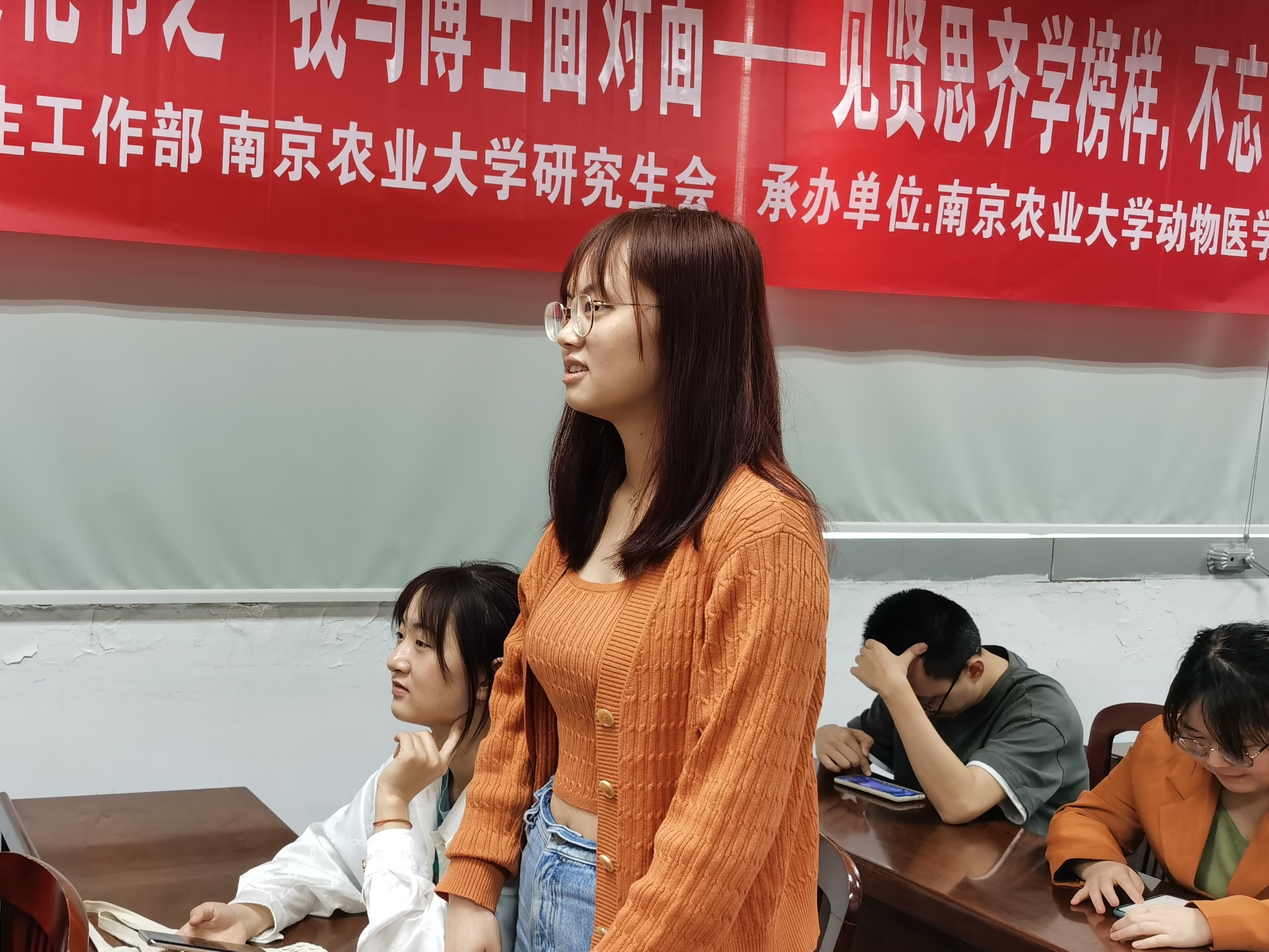 在主持人许秋华的介绍下活动拉开了帷幕,同学们热情鼓掌欢迎每一位嘉宾的到来。第一位与大家进行交流的是2017级临床兽医系博士研究生刘丹丹师姐。刘丹丹师姐的演讲紧紧围绕主题“你的坚持终将美好”展开,她像一位大姐姐一样和大家亲切交流,将自己读研这些年的亲身经历和心路历程娓娓道来,对大家的读研目标和制定规划提出了非常多实用的建议,参与交流的同学们都受益匪浅。