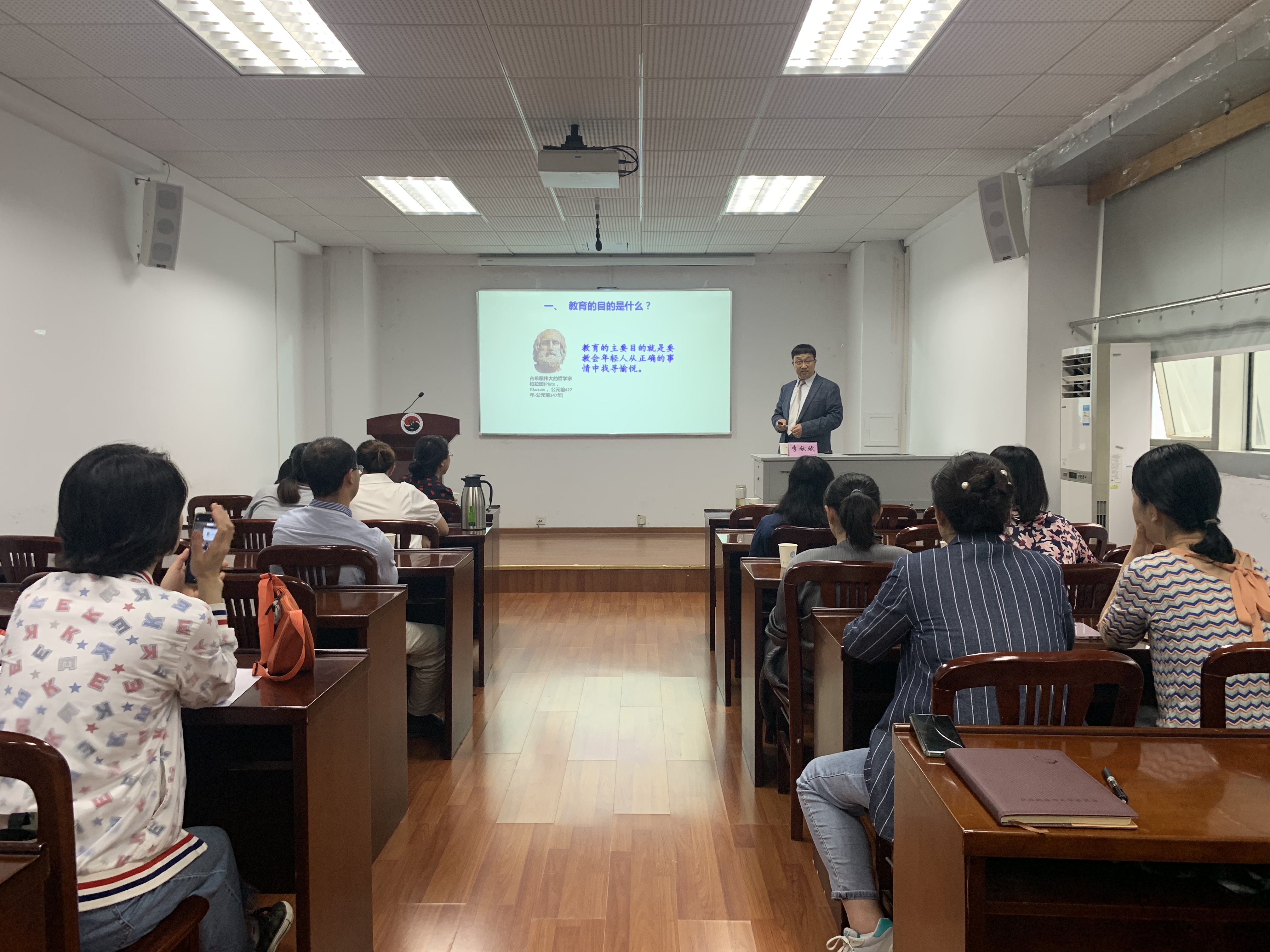 李献斌以《教师如何成为员工心灵的使者》为题,以儒家思想等中国传统文化和教育心理学的知识为基础,结合案例,生动展示了教师成为心灵使者的过程,转变教育观念,以员工为中心,开展启发式教学,开展心理健康教育,引导教师运用理性情绪疗法的ABC理论,帮助员工阳光心态、管理情绪、理解生命的意义。