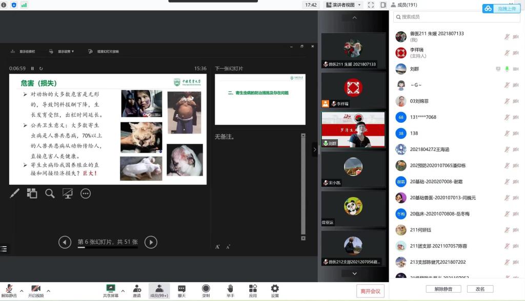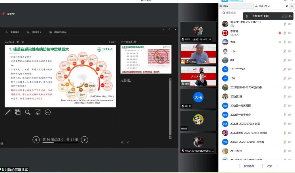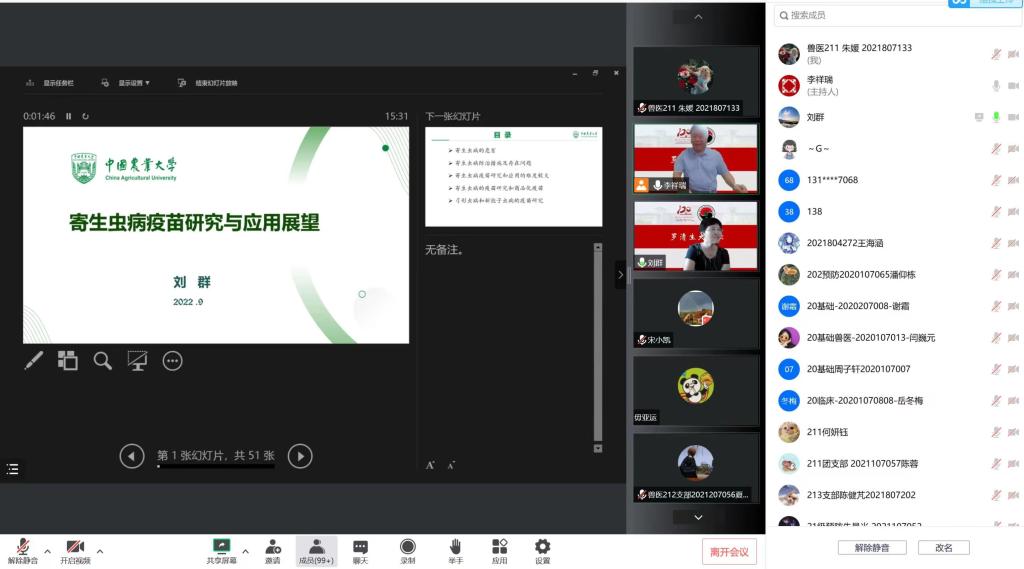 2022年9月15日,QY球友会成功举办罗清生大讲坛。应疫情防控要求,本次讲坛采用线上方式举行。本次论坛有幸邀请到中国农业大学QY球友会教授,中国畜牧兽医学会家畜寄生虫学分会理事人,博士生导师刘群教授进行寄生虫病疫苗研究与应用展望的分享。学院师生积极参加。