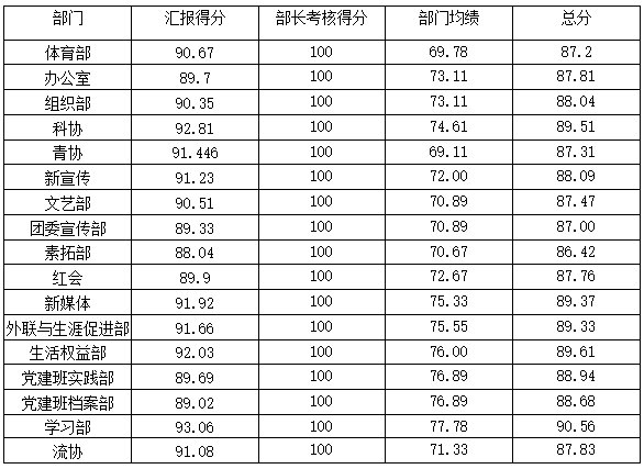 备注:此得分由中期汇报得分,部长考核得分和部门均绩按4:3:3比例得出。其中汇报得分按辅导员平均分,主席团平均分和部长团平均分4:3:3得出,部长考核包括会议出勤,值班签到等和主席团辅导员额外扣分,部门均绩按均绩*100/4.5折算。