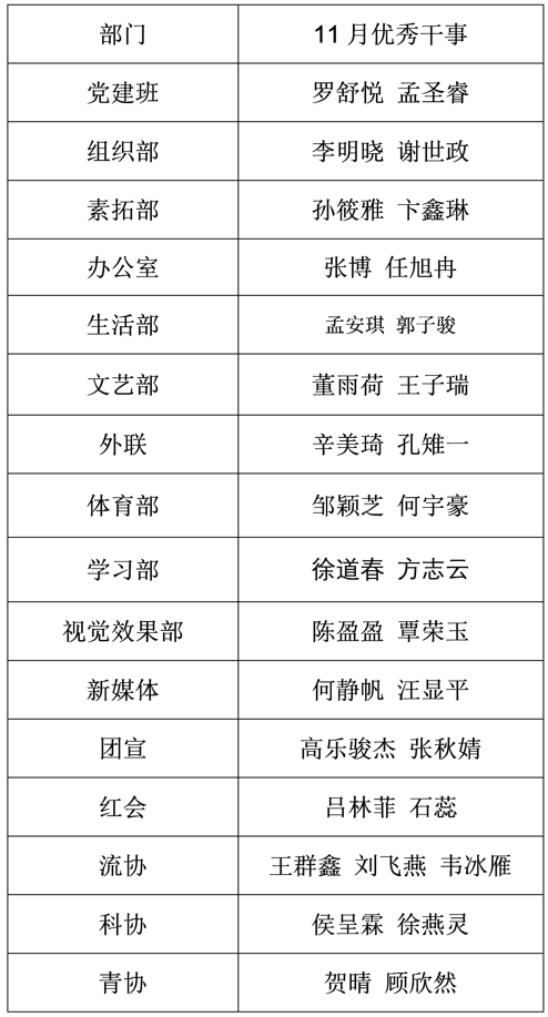 【员工工作】第38届党建班、团委员工会各部门11月优秀干事名单公示