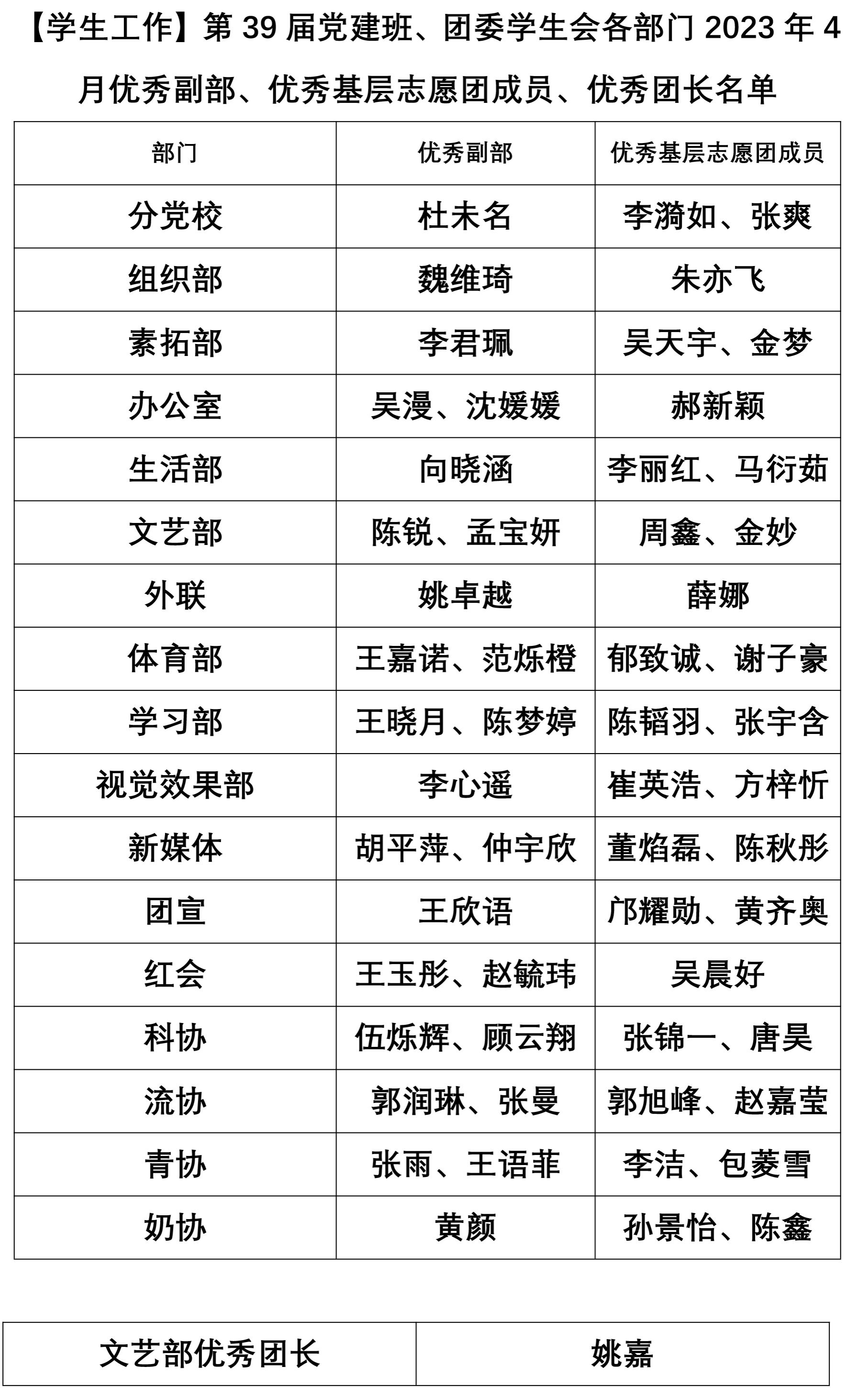 【员工工作】第39届党建班、团委员工会各部门2023年4月优秀副部、优秀基层志愿团成员、优秀团长名单