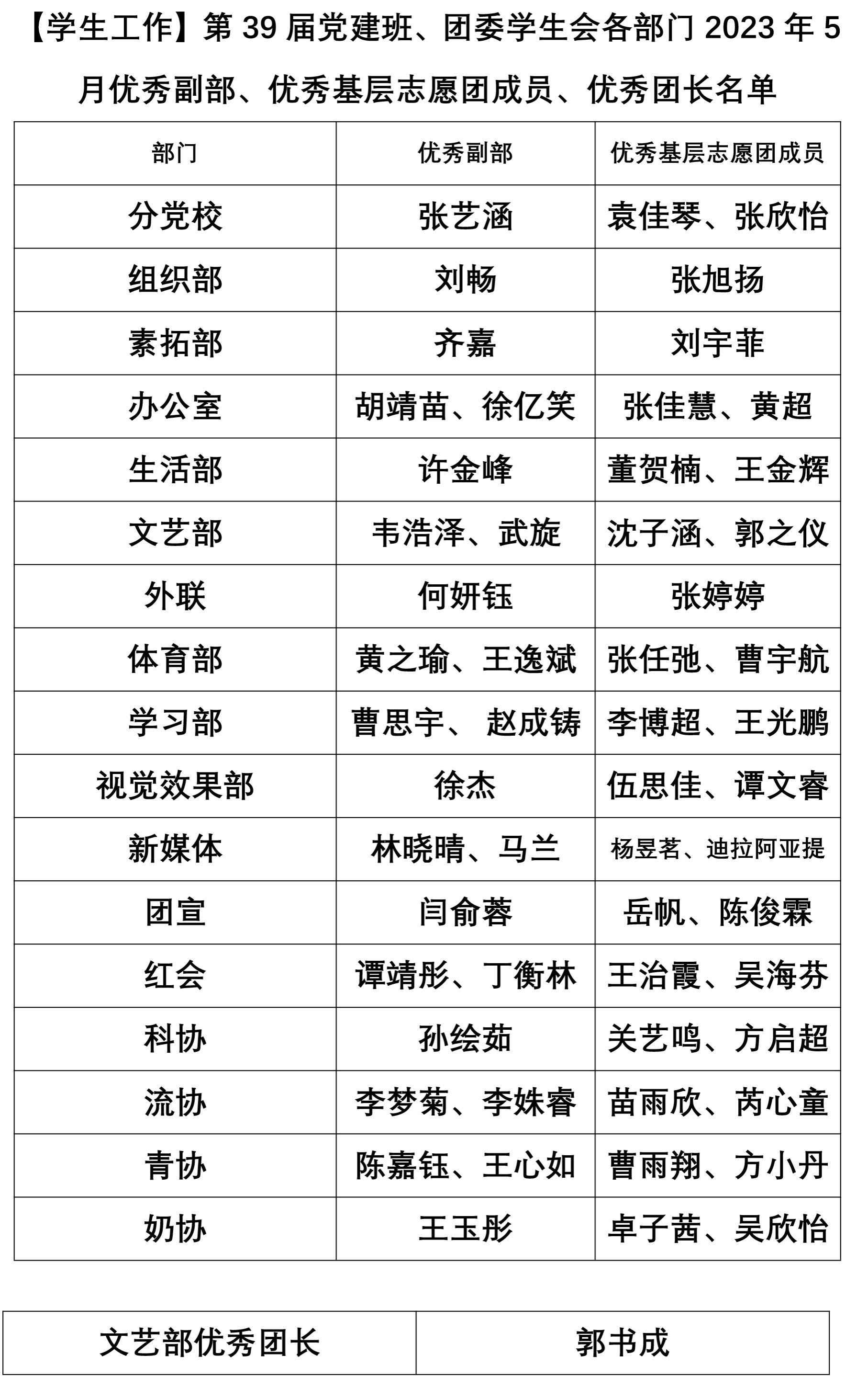 【员工工作】第39届党建班、团委员工会各部门2023年5月优秀副部、优秀基层志愿团成员、优秀团长名单