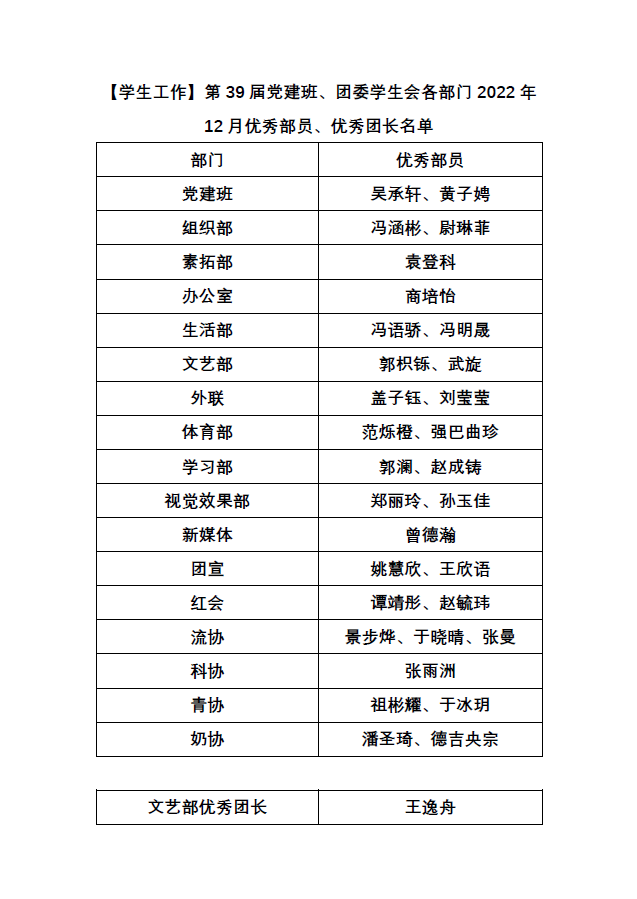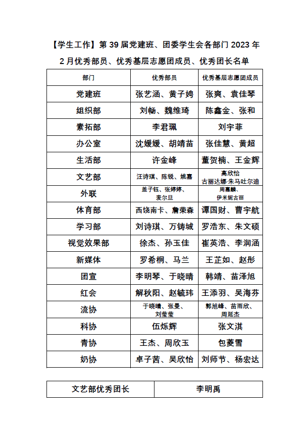 【员工工作】第39届党建班、团委员工会各部门2022年11月、12月及2023年1月、2月、3月优秀副部、优秀基层志愿团成员、优秀团长名单