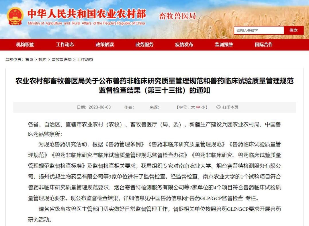 QY球友会体育兽药研究评价中心获得农业农村部兽药GLP试验评价资质
